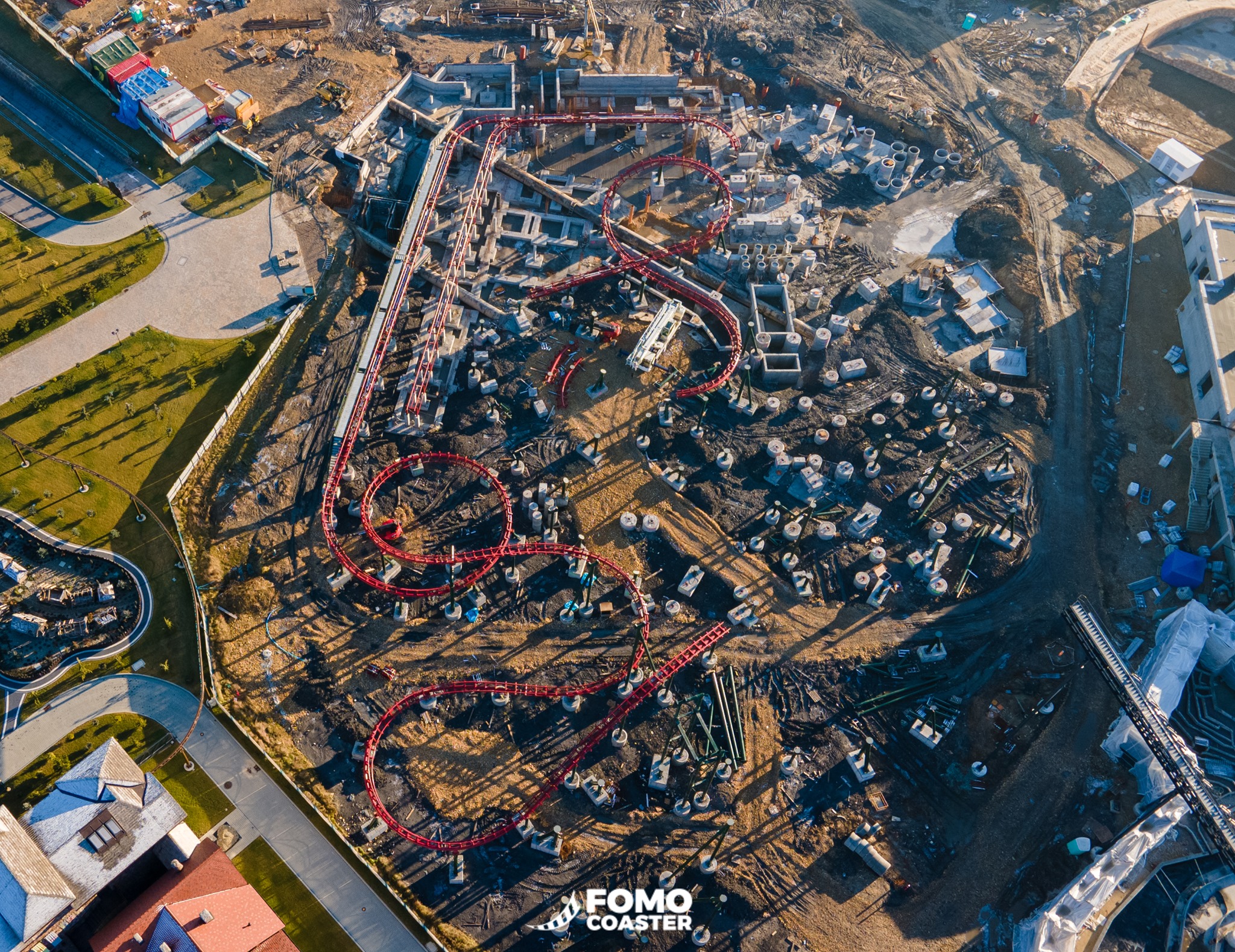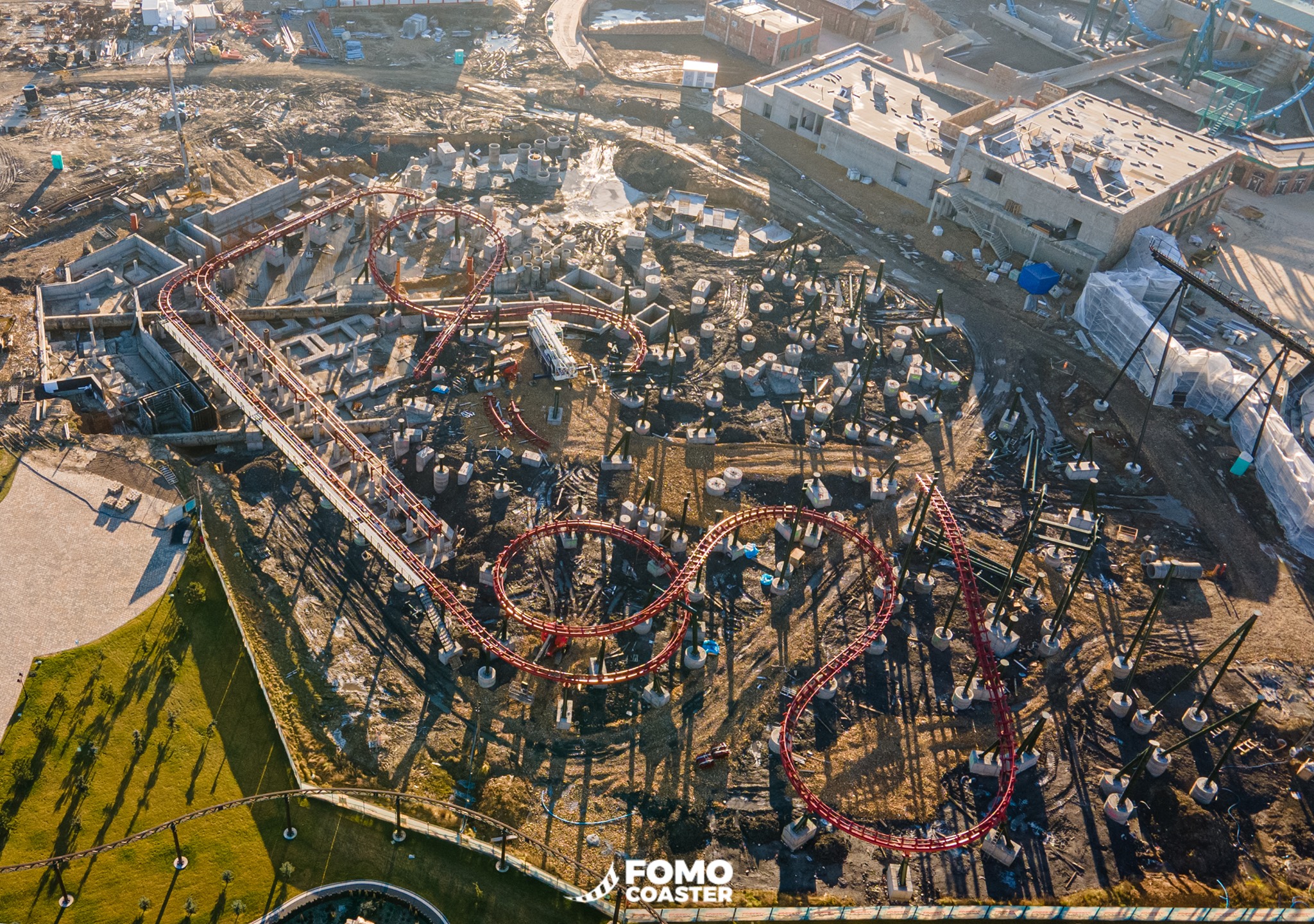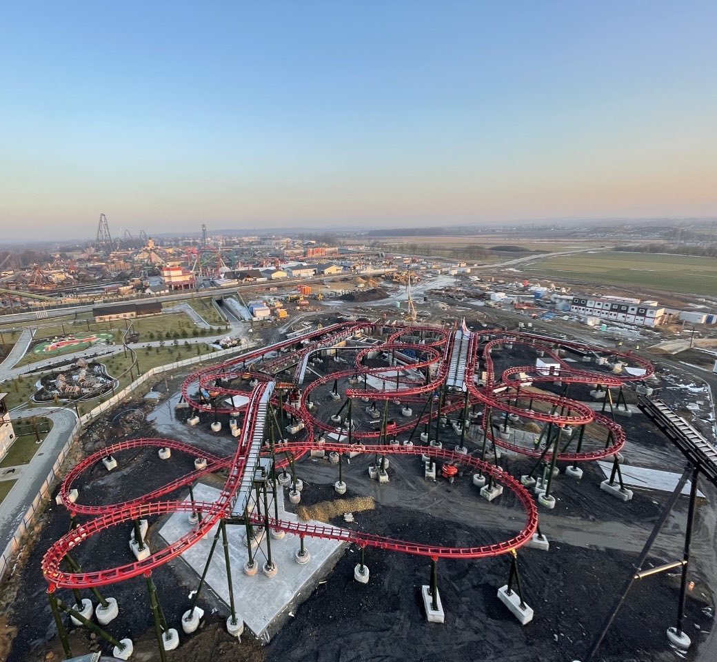 Jawel.. Je kunt goed zien waar het station komt. Dan is er al een bocht naar rechts aan gelegd. Verder dan dat zijn er vooralsnog enkel footers, maar deze footers lijken me wel bedoeld voor een dubbele lifthill.