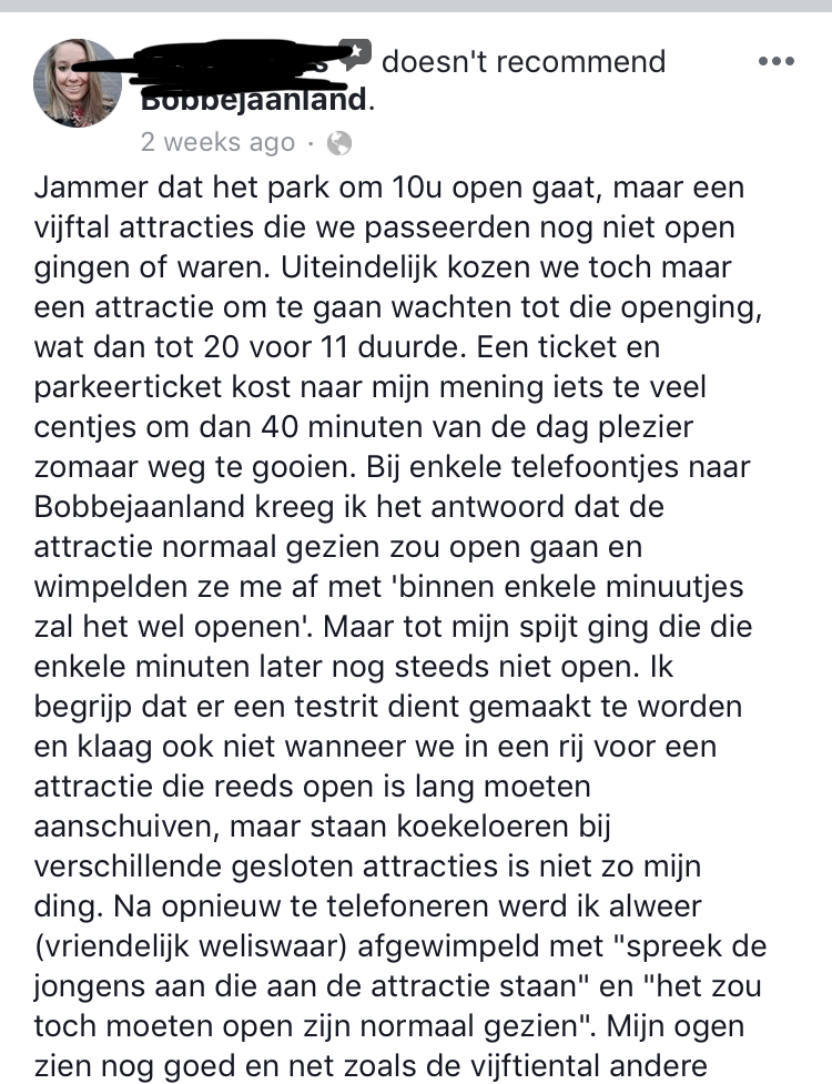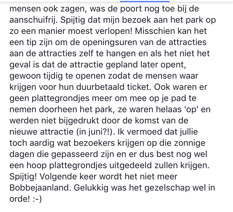 Ga dat dan eens even verkondigen aan dagbezoekers die alles uit hun dag willen halen. Je kalender zegt dat je open bent van 10u tot 18u? Dan blijf je ook (operatief) open van begin tot eind. Moest een park als de Efteling, Phantasialand of Europa-Park zo handelen zou het kot te klein zijn, dus ik zie niet in waarom Bobbejaanland wel zo mag handelen.