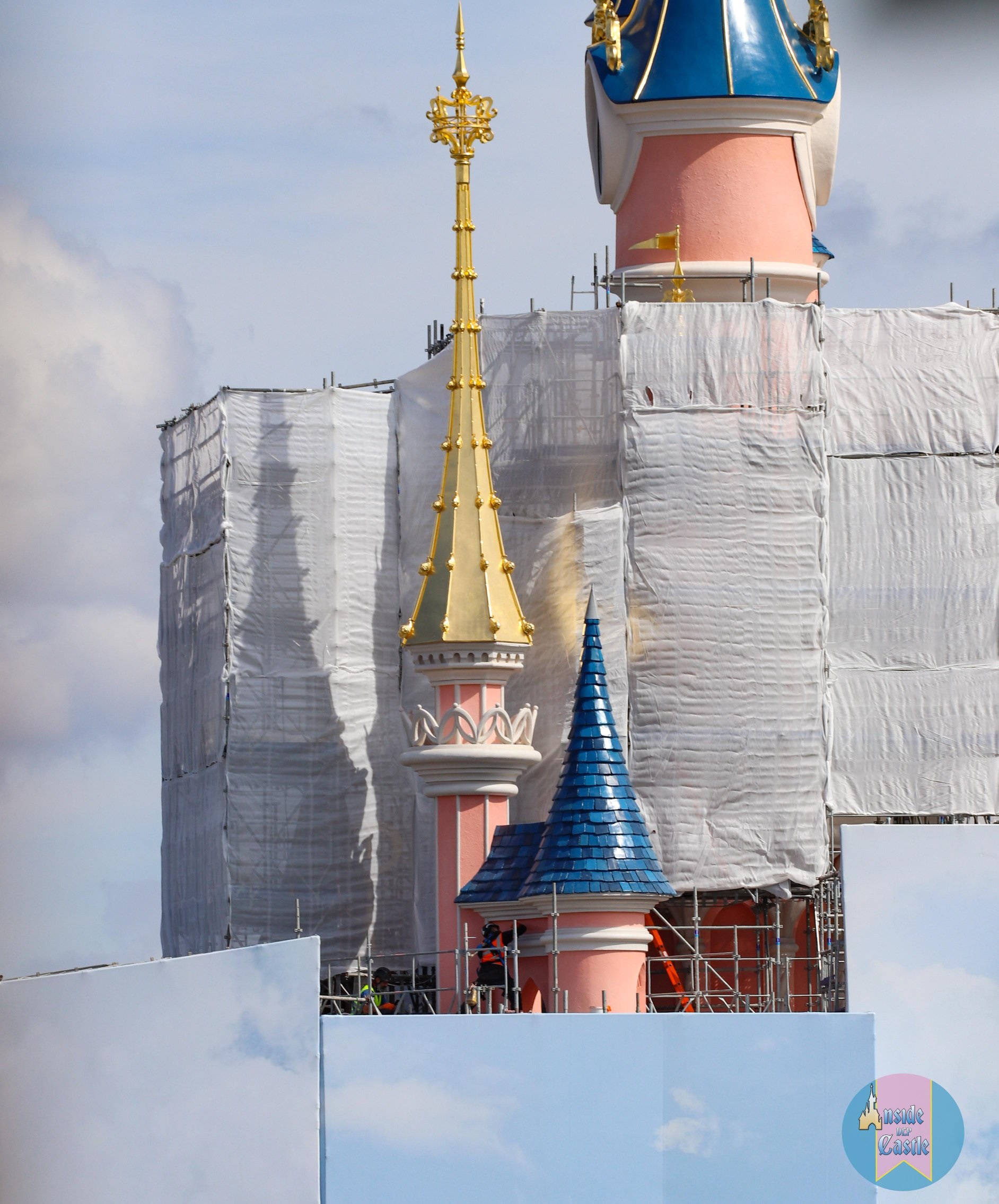 Het kasteel is ondertussen grotendeels opnieuw te bezichtigen langs de voorkant. Nog enkele gouden toppen ontbreken. Aan de achterkant werd ook de houten trap teruggeplaatst.