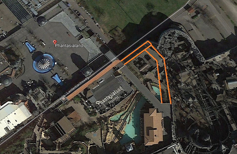 De brug doortrekken over klugheim zie ik niet gebeuren. De aansluiting bij de Kaiserplatz is veel te belangrijk om een goede infrastructuur te hebben. De hoek zoals hierboven ingetekent leidt nergens naar toe en zou volstrekt geen nut hebben. Zelfs als je het pad zou doortrekken over de straat heen, krijg je een pad dat volledig langs de rand van het park loopt, zonder dat je aan de noord-oost kant de kans hebt daar een attractie aan te sluiten.. Wat dus betekent dat het plaatsverpilling is, aangezien enig project op die wei ook al op de kaiserplatz zou kunnen aan sluiten. Je ziet dit effect al bij het pad dat achter Colorado door loopt. In de huidige situatie is dat ook volstrekt weg gegooide ruimte. Niemand komt daar, behalve om naar de ingang van Colorado te gaan (die op een logischere plek had kunnen liggen). Ooit had er nog een attractie aan de zuidoost kant kunnen liggen, maar daar is nu de oprit naar het Hotel toe.