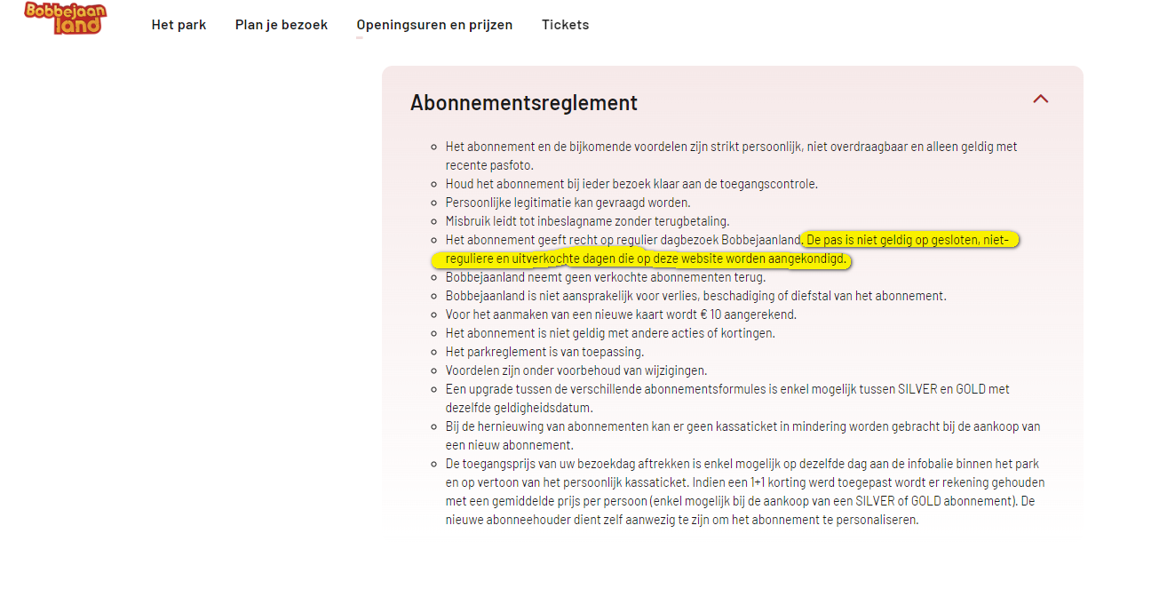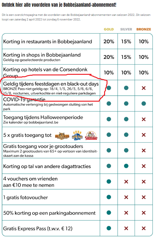 Bij de abonnementsvoordelen staat geldig tijdens feestdagen en Black Out Days, er staat niet dat de passen geldig zijn op niet reguliere parkdagen. Er staat enkel een footnote dat de Bronze pass op een heel aantal dagen niet geldig is en daarin staat vermeld dat die niet geldig is op niet reguliere dagen. Mss verwarrend maar wel correct. Er staat dus nergens dat Silver en gold op niet reguliere dagen geldig is.