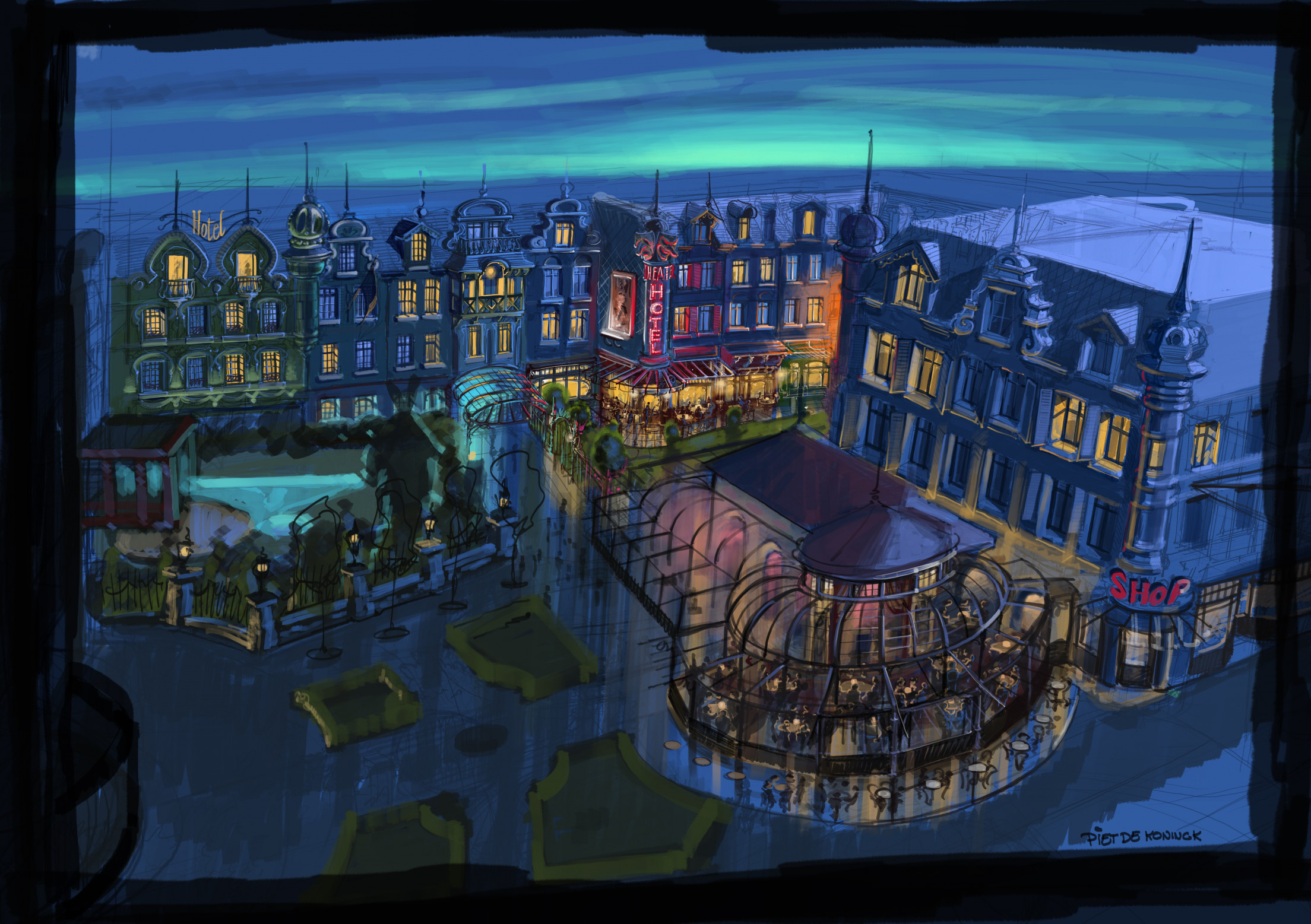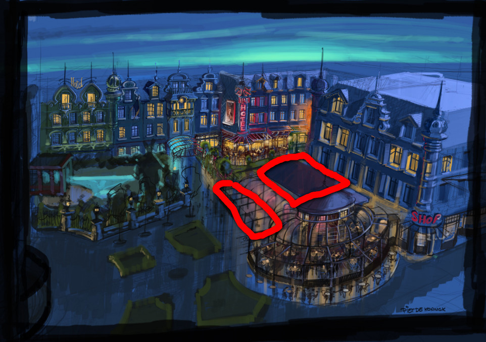 Op de concept-art staat ook het viking saunahuisje naast het buitenbad van Plopsaqua nog ingetekend. Ik gok dat het de bedoeling was dat die ook eerst bleef staan maar het lijkt me dat ze het wandelpad en doorgang naar Plopsaqua hebben opgeschoven waardoor de sauna toch moest verdwijnen.
