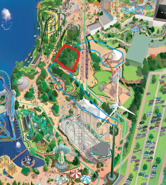 Het lijkt mij sterk dat ze ook de bootvaart betrekken in het nieuwe thema. Die ligt afgelegen en heeft op zich al een degelijk uitzicht waar niemand zich aan stoort. Ook de locatie van de nieuwe coaster lijkt me een beetje vreemd. Als ze Typhoon en Sledgehammer met de coaster tot één zone willen verwerken, lijkt het mij logischer dat die baan ergens rechts van de witte tent en sledgehammer zijn station heeft, parallel met de parking. Dan verbindt de coaster de attracties binnen de zone toch al. Eventueel kan er dan nog steeds een lust gemaakt worden tot aan dat pleintje met die pergola.