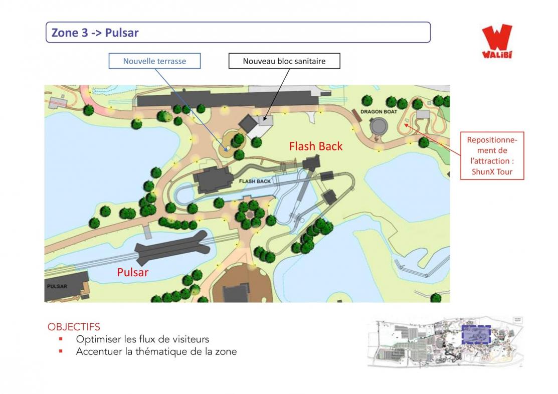 Op bovenstaand plan is het nog duidelijk dat er een kinderattractie verplaatst wordt naar deze zone. De vraag blijft natuurlijk bij welke zone de Dragonboats gaan horen. Persoonlijk denk ik dat ze meer gaan thuishoren bij een haventhema, wat altijd al het idee is geweest van de zone rond Pulsar, PU, FB en de Dragonboats. Daar komt dan ook deze kinderattractie bij. Waarschijnlijk zal de scheiding dus ergens tussen deze kinderattractie en de Salsa Y Fiesta te komen liggen.
