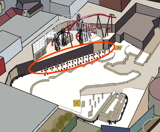 De manier zoals hierboven wordt uitgelegd is wel een "tweede favoriet". De meesten geloven er niet zo in, maar onrealistisch is de situatie niet. Rechts van de paarse lijn zijn namelijk een hoop pilaren gezet. Het kan dus prima zo zijn dat daar de hekjes komen voor het instappen en/of de diverse wachtrijen (gewoon, fastpass, SRL) doorheen gaan lopen. Je ziet die pilaren ingetekend staan op de potloodtekening wat hogerop. Als die tekening echter klopt, is er aan beide kanten geen plek voor station aangezien er overal een muur omheen staat. Nu kan er rustig ergens een deur in die muur zitten, maar die lijkt niemand te hebben gezien (al is dat natuurlijk ook zeer moeilijk om te herkennen).