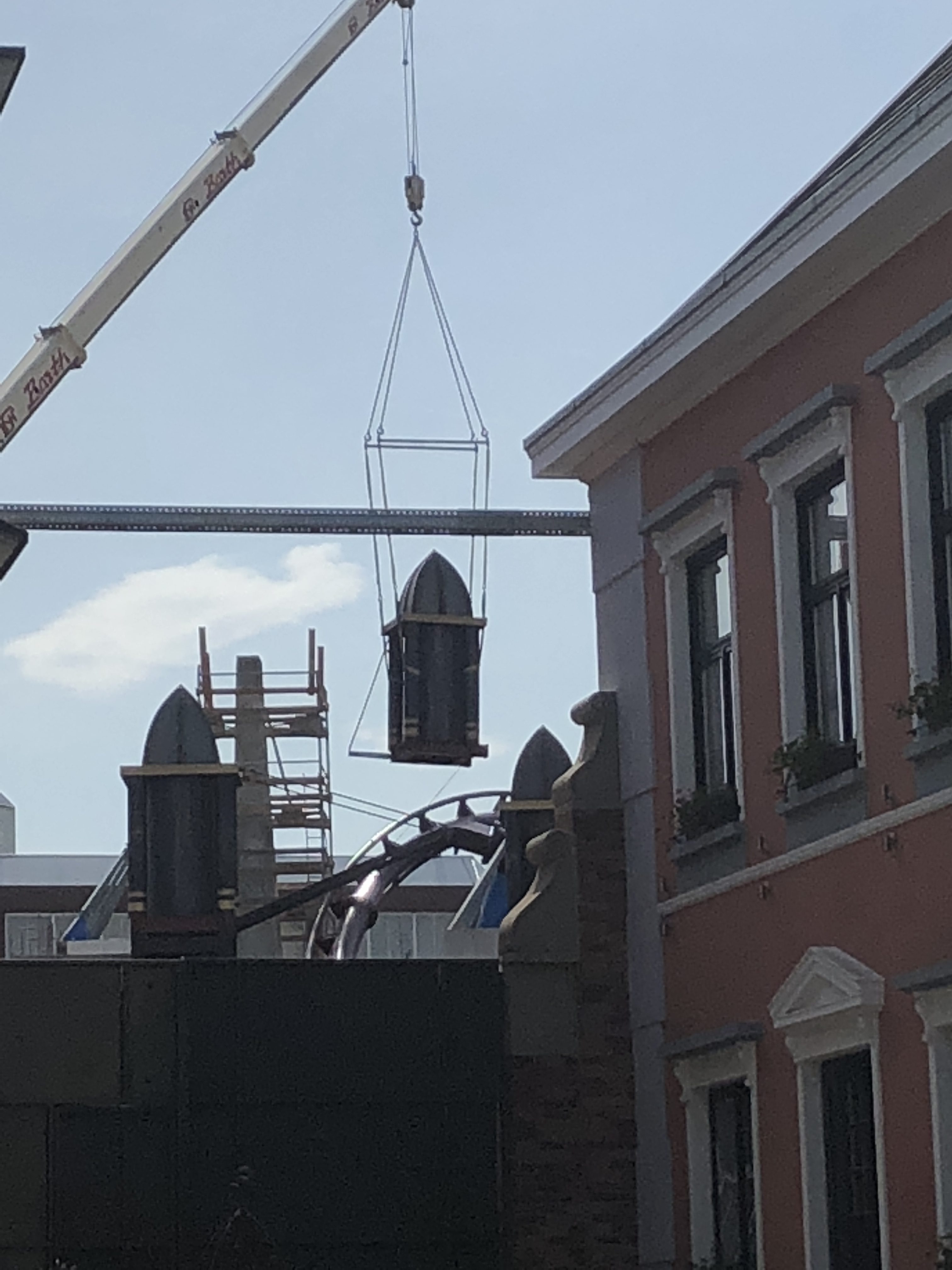 Gisteren zijn zes nieuwe torens in de vorm van die citroen pers geleverd op de opslagplaats nabij de bouwplaats. Van deze torens zijn er al vier reeds geïnstalleerd. Twee torens zijn groter dan de vier anderen.