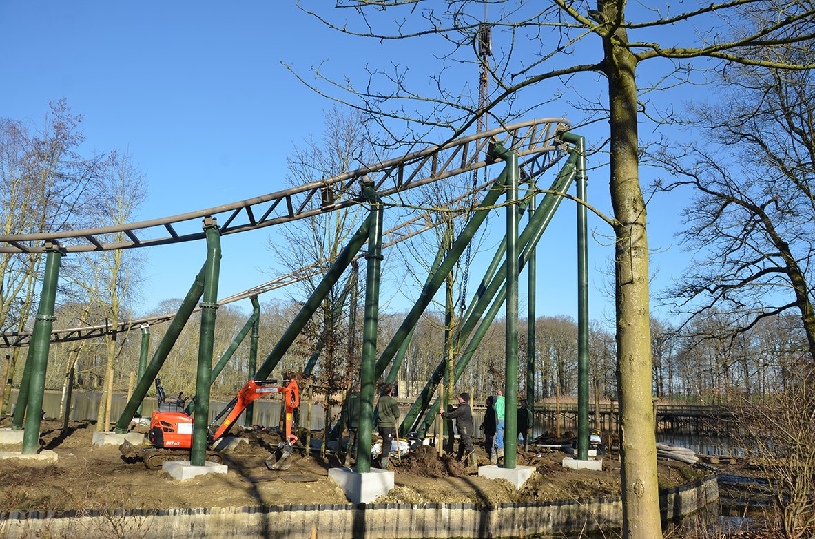 Het gaat vooruit in Bellewaerde: ondertussen staat al een groot deel van het station overeind en liggen er al paden voor de wachtrij.