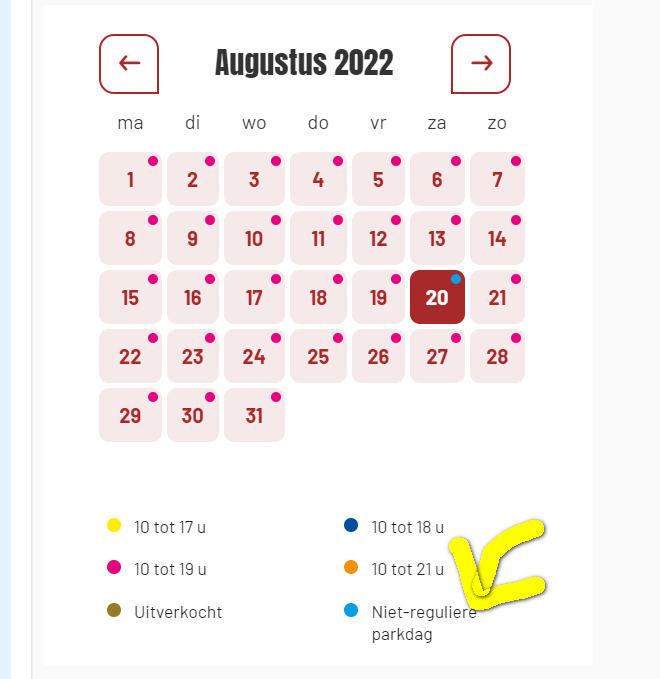 Wanneer ik op de site van Bobbejaanland kijk en gewoon naar openingsuren klik zie ik deze kalender met vier uitverkochte dagen.