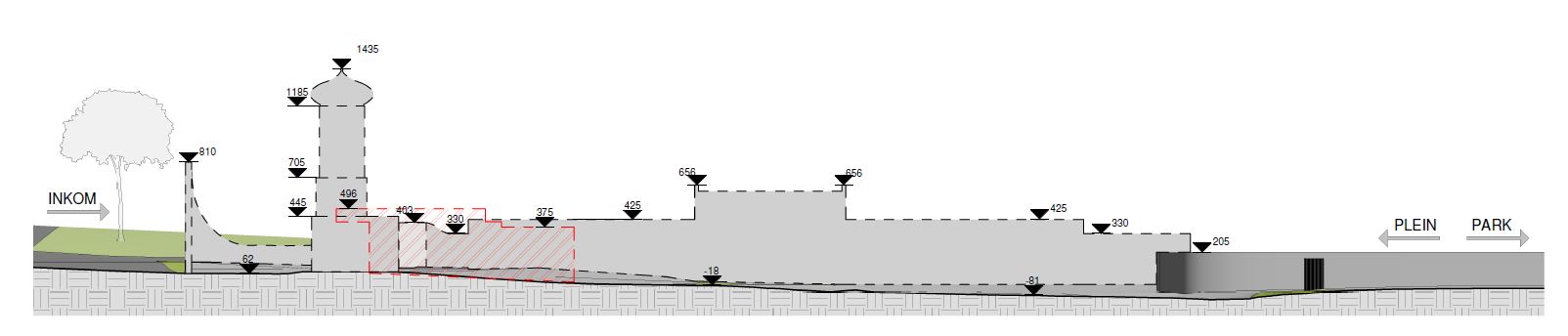Het betreft het slopen van een bestaand inkom gebouw (rood gearceerd op de profieltekening) en het bouwen van een nieuwe volwaardige inkom aan parking C + heraanleg van de omgeving rondom het nieuwe inkomgebouw.